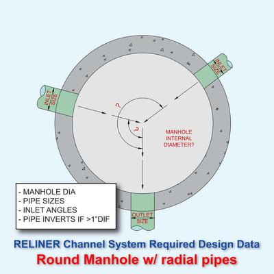 Contact RELINER for assistance in selecting the proper system components for your application. Parts are selected based on the unique configuration of each manhole. Required information includes the diameter of the manhole, angular location and size of each incoming pipe and the outlet, and any other special considerations that may apply such as variations in the inlet elevations of more than 1”, irregular shaped structures, or pipes that are not radial. The attached sheet can be used to provide this information. Emailed photos are also helpful.