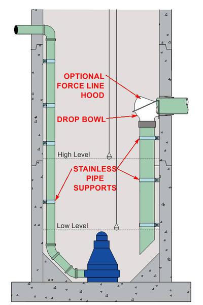 Wet Well inside drop with optional Force Line Hood. Any length of drop can be accommodated.
